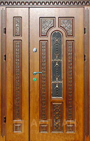 Двухстворчатая входная дверь со стеклом и ковкой №9
